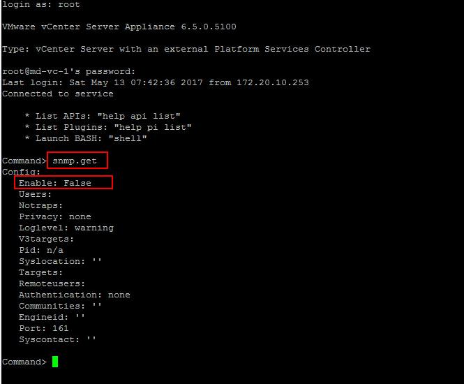 To get the current Simple Network Management Protocol configuration of vCenter Server appliance 6.5, Loging to the vCenter Server appliance using SSH and execute the below command